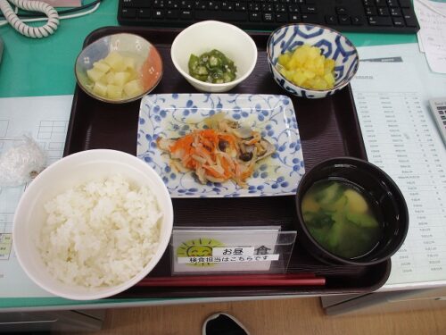 さつま芋とリンゴの甘煮🍎・オクラ三杯酢・味噌汁・缶果物🍑