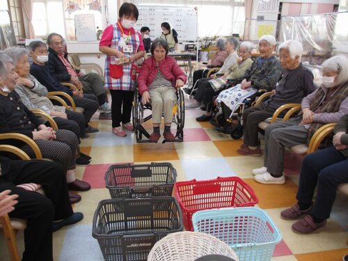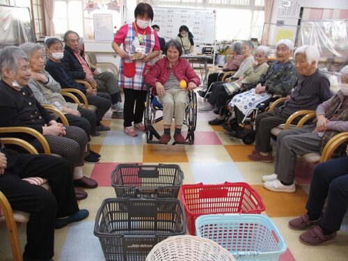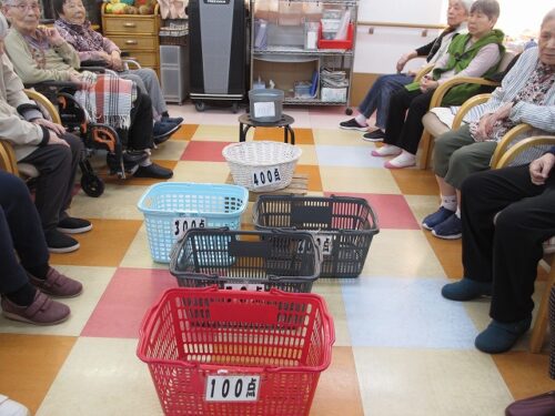 ピンポン玉を床に投げてはねたピンポン玉をカゴに入れるゲームです🎶