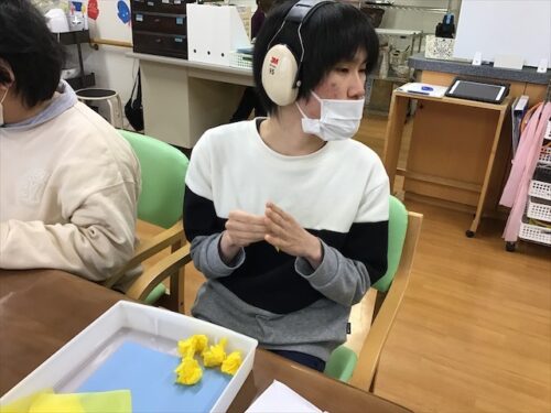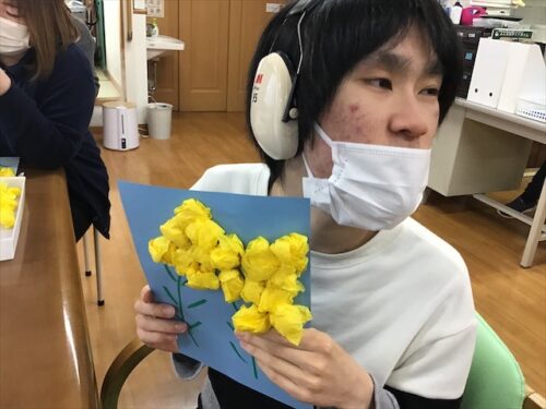 こちらの利用者様は黄色のお花紙を丸めていますね〜