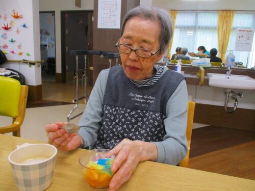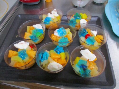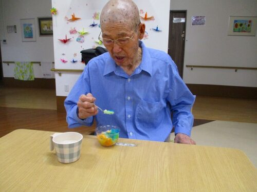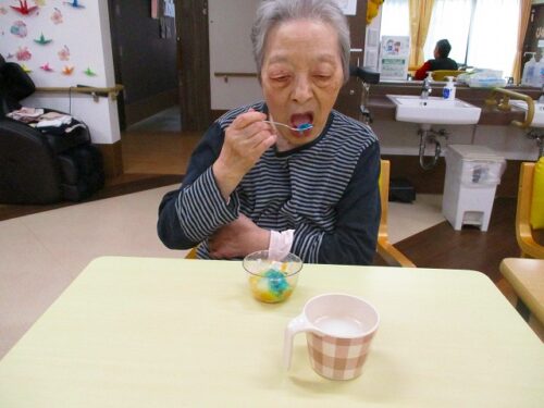 さわやかグループホーム むろらん 七夕祭り♪ 2024-07-09 2024-07-09 みなさまこんにちは。七夕祭りをしました~ あんみつの中にメロンを入れ、星形にカットしたゼリーを飾り皆様に喜んでいただきました。 職員も入り写真を撮りました。