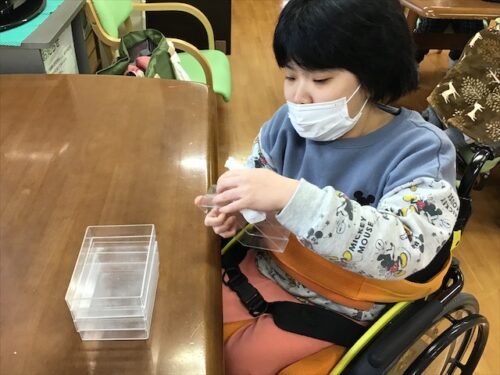 こちらの利用者様は、割り箸を袋に入れていく作業をされています。