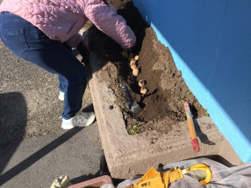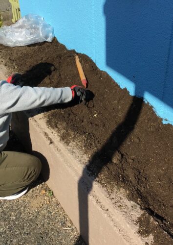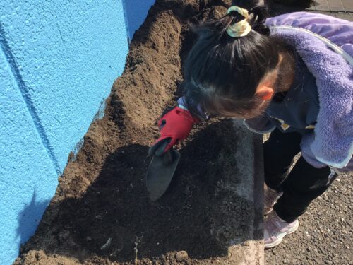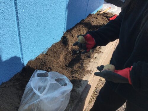 しゃがいもを入れたら、土を被せ、芽が出る日を楽しみにしています🎵
