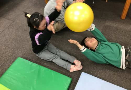 仰向けになった状態で、友達からボールが回ってきたら受け取ります😊