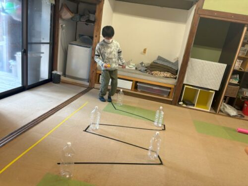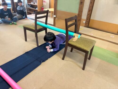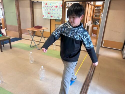 平均台→スプーン運び→棒くぐり→棒飛び→お尻歩き