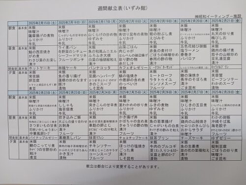 さわやかいずみ館 2月後半 さわやかいずみ館 2025-02-16 2025-02-17 こんにちは😄 2月後半の献立表です🍴 後半の予定は 19日 フラワーアレンジメント 22日 訪問理美容 23日 誕生会