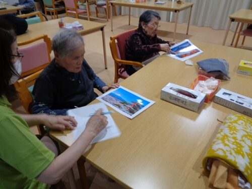 こちらは職員さんと塗り絵をして頭を使い脳トレ中でした!
