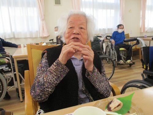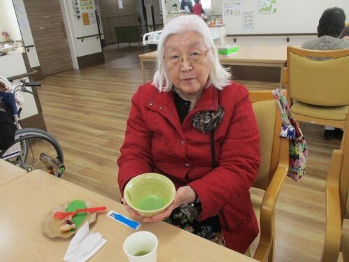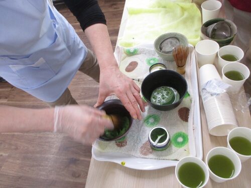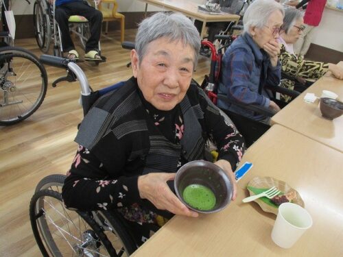 今日は職員が抹茶を立てておやつと一緒に提供させていただきました
