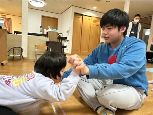 活動で「座り相撲」をしました。年下に気を配りながら力加減を考え年下の児童と活動を盛り上げてくれています。
