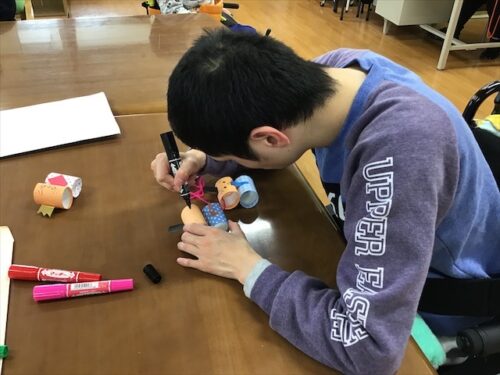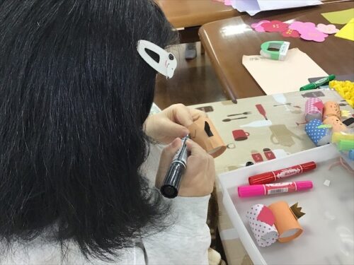 トイレットペーパーの芯を半分に切って折り紙を貼ります