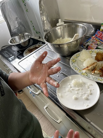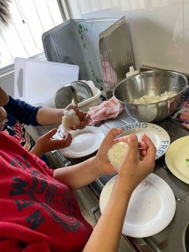 お昼ご飯は自分で作ったおにぎりをランチプレートにのせたおにぎりランチです。ラップでおにぎりは家庭でも経験したことがあっても、素手でだと勝手が違うので悪戦苦闘する人も…。(どうにか形になって ホッ。)でも、苦労した分美味しかったですね!