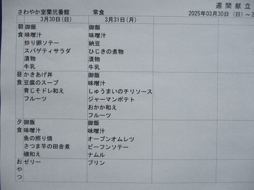 さわやか室蘭弐番館 3月 献立♪ 2025-03-01 2025-02-28 皆様こんにちは♪ 今月の献立をお届けします 行事食は3日(月)昼食 22日(土)昼食です 食材の都合により急遽 変更させて頂く場合もございます ご了承下さい<m(__)m>
