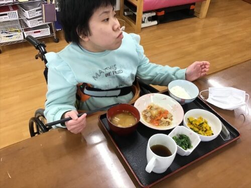 こちらの利用者様は、自身で食べられるように、スタッフと一緒に練習中です☺️