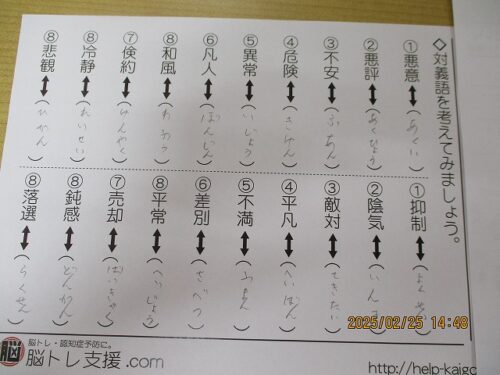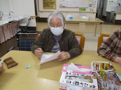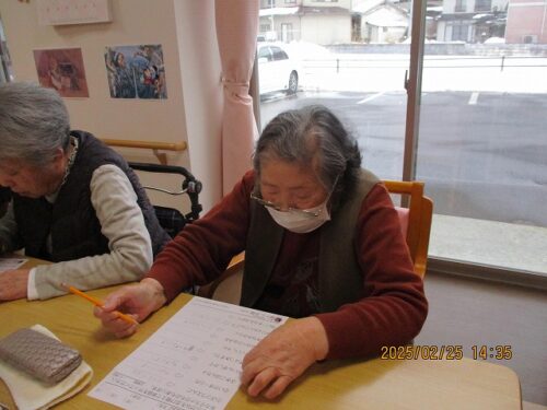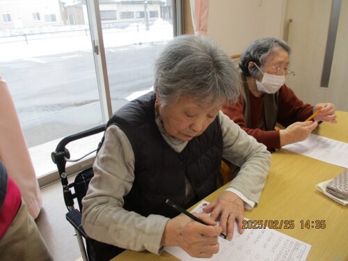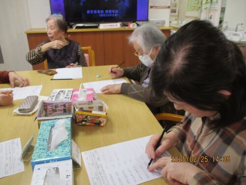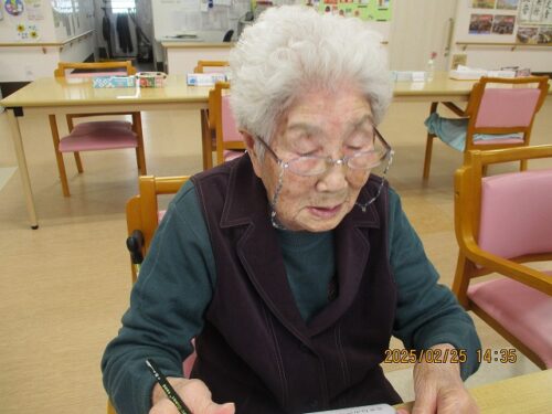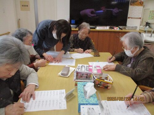 今日は朝早いですが、昨日行われた脳トレのレクをしている