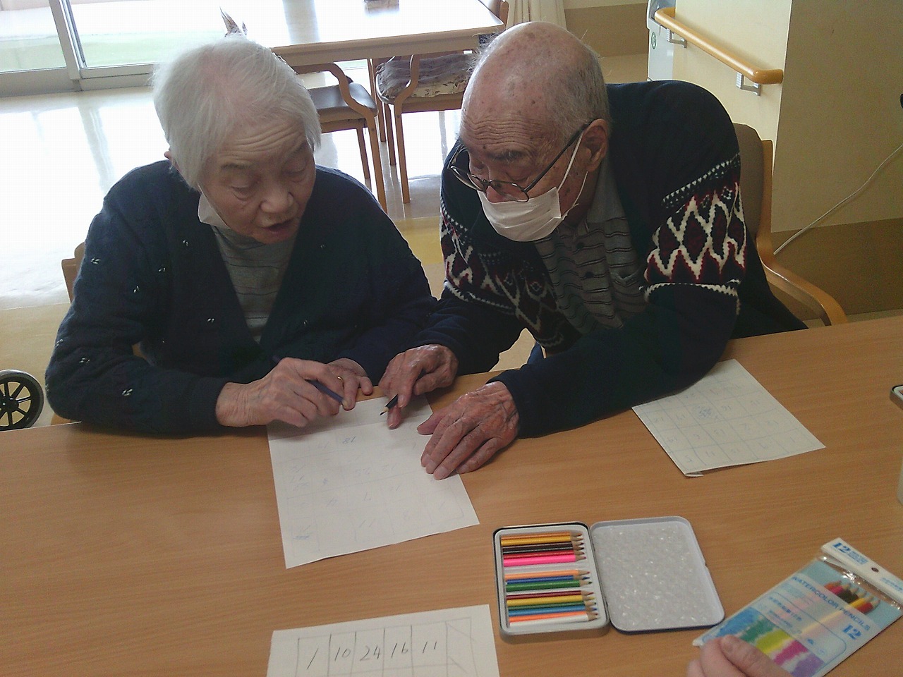 朝のラジオ体操後、皆で集まり何やら賑わっています☺紙に数字を書き脳トレゲームを行ったり、出されたお題の絵を書いたりと…それぞれ書いた絵を見て、ワッハッハー!!と朝から大きな笑い声が聞こえています(^^♪
