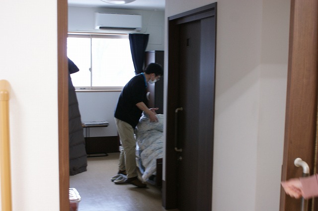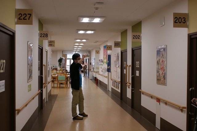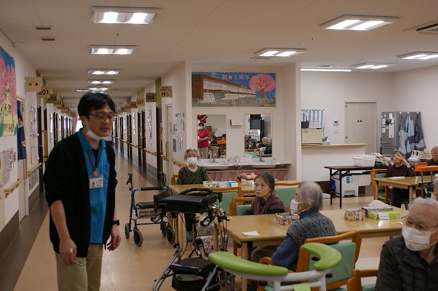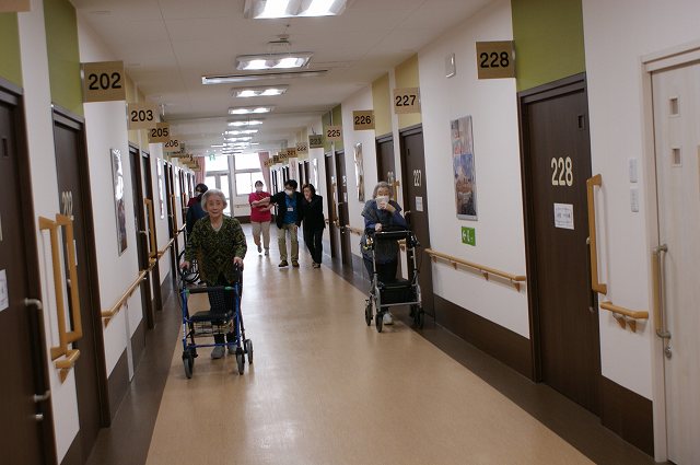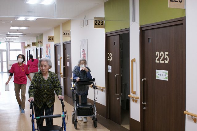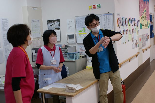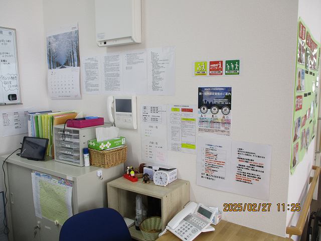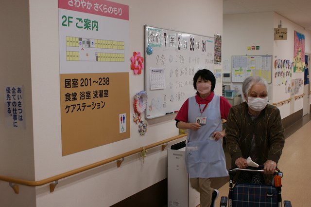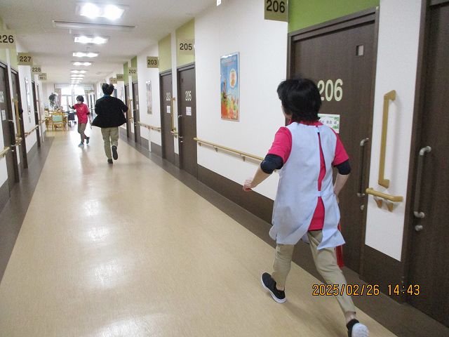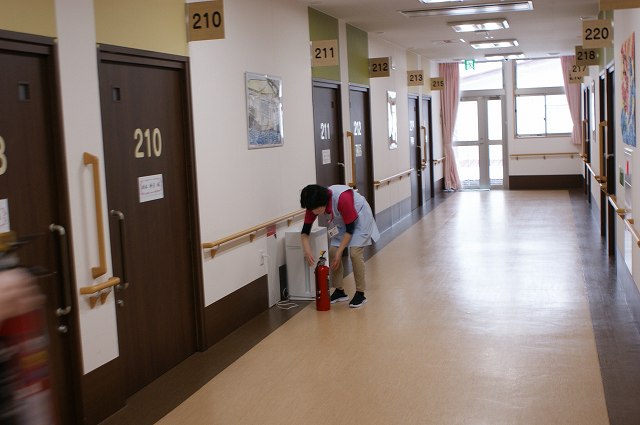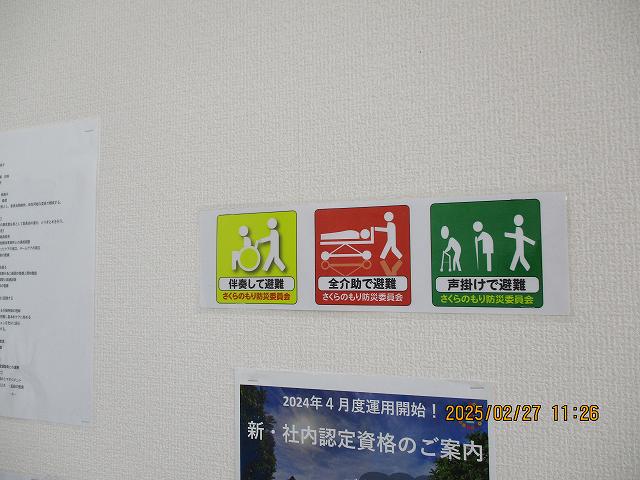 さくらのもりはその人に合わせた避難方法をケアステーションとの全居室のドアに貼ってあります。緑班とそれ以外班に分かれて誘導を行います。避難が終わった居室は付箋を貼ってその居室に誰もいない事をしまします。