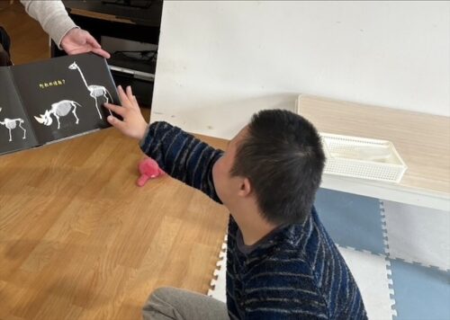 想像力を働かせて骨から何の動物?かを考えてみたり、色んな絵本で