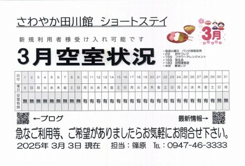 さわやか田川館のショートステイ、空室状況を知らせします。