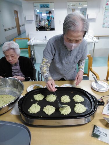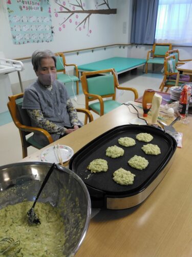 利用者様に粉と卵を混ぜて頂き、キャベツ、紅ショウガ、天かすを加えて焼いていきます☀️☀️