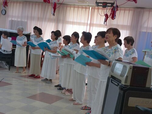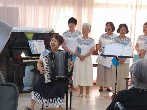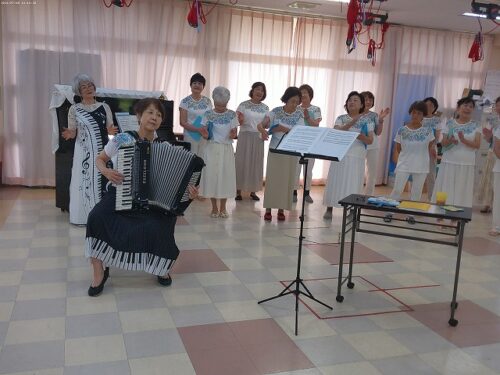 讃美歌、夏は来ぬ、七夕様、花火など、唱歌。アコーディオン伴奏で、真っ赤な太陽、エーデルワイス、東京ブギウギ…♪