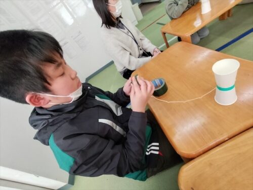 最初に、紙コップの底に糸をつけ、紙コップ同士をくっつけて、