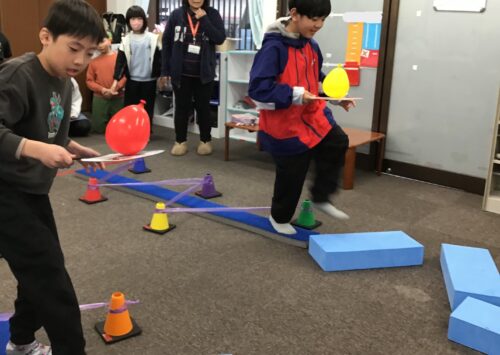 でこぼこコースをおもりの入った風船が落ちないように進み・・・
