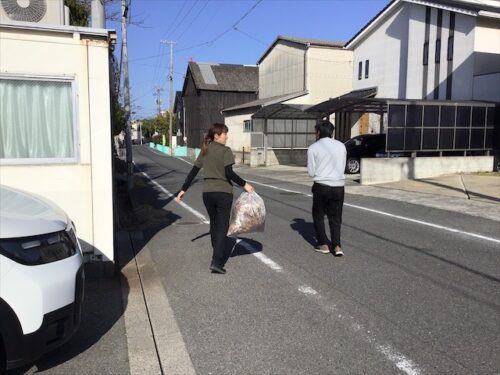 終わりは、集めた落ち葉をゴミ置き場に職員と持って行きました。
