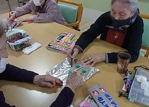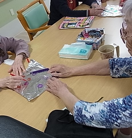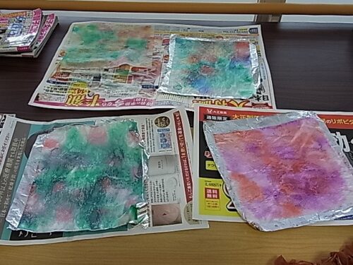 さわやか室蘭弐番館 2階 18日午後の様子♪ 2025-03-19 2025-03-19 皆様こんにちは♪ 昨日の午後の様子をお届けします おやつ前に各テーブルで作業されいています アルミホイルにペンを使い着色していきます その上にキッチンペーパーを 被せると・・・ ⇓ご覧下さい⇓ 綺麗な色が浮かび上がりました!
