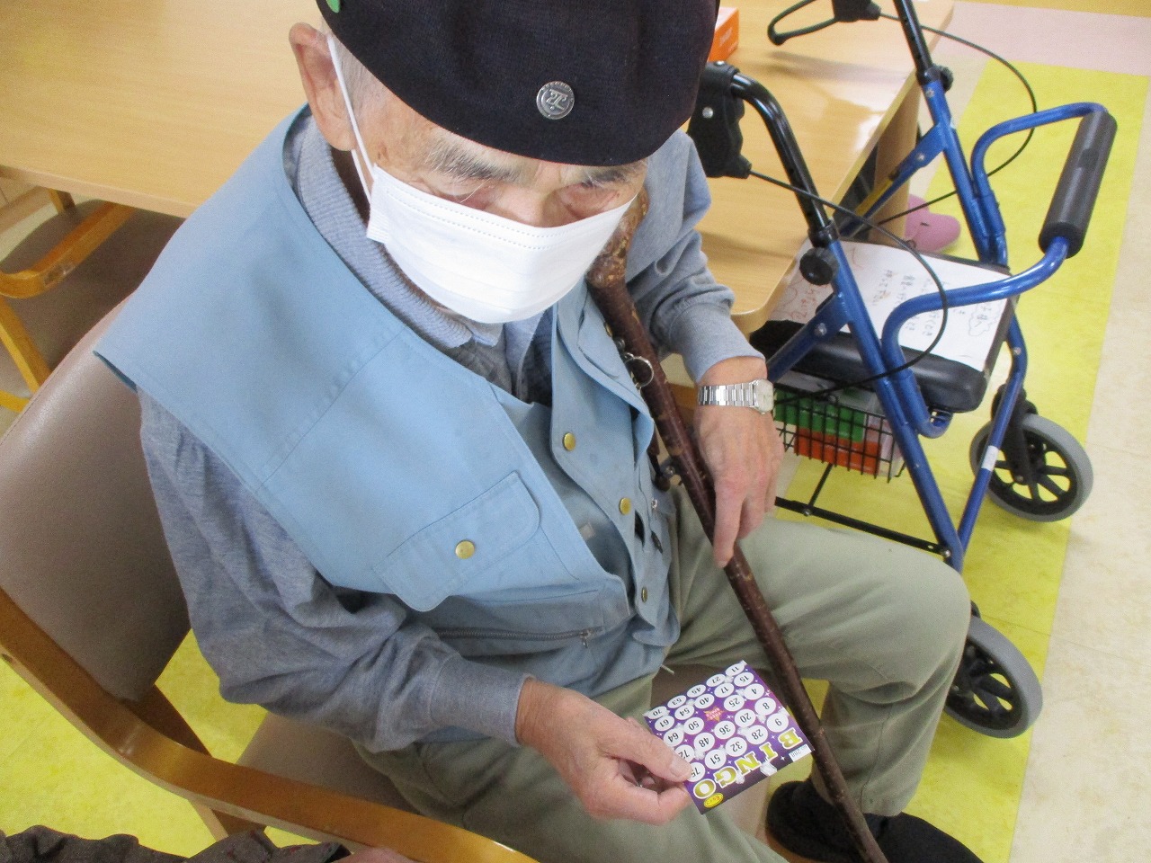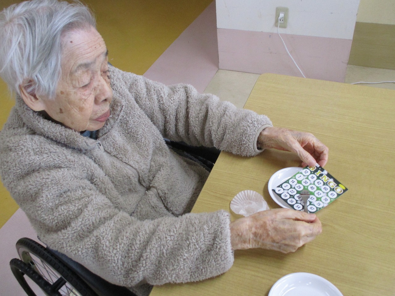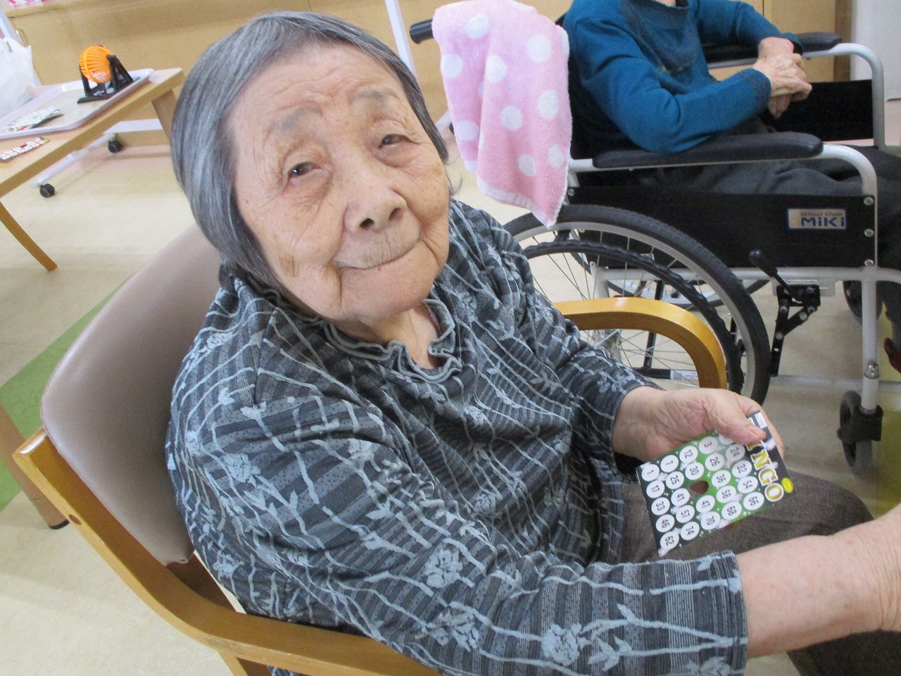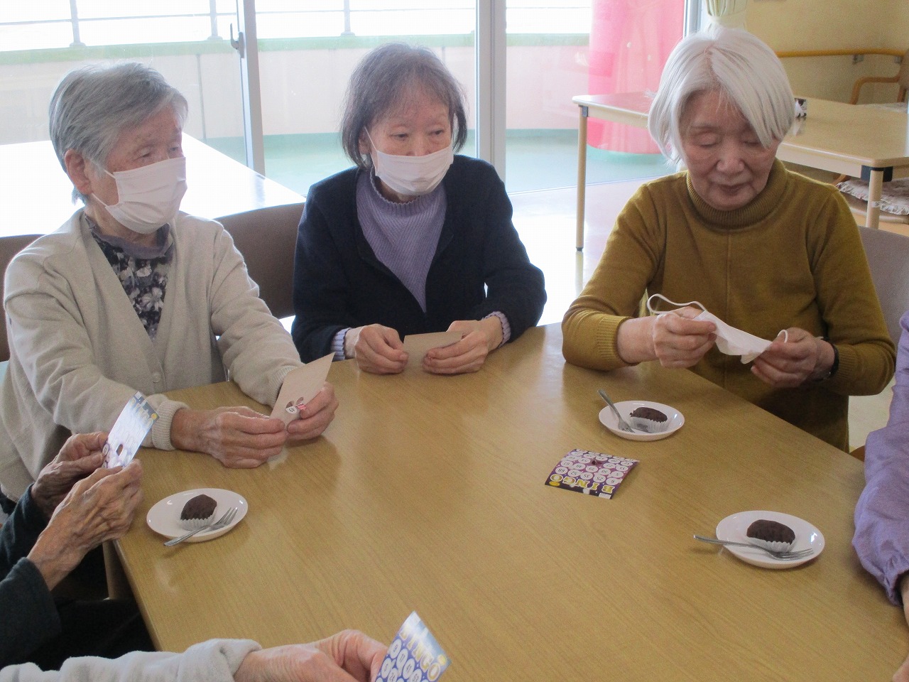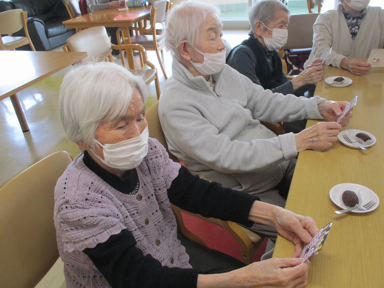 そして、本日はおやつのおはぎを食べながら、ビンゴ大会が行われています!!皆様真剣な表情で参加されています☺