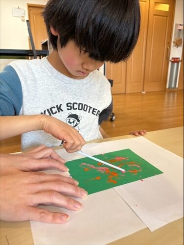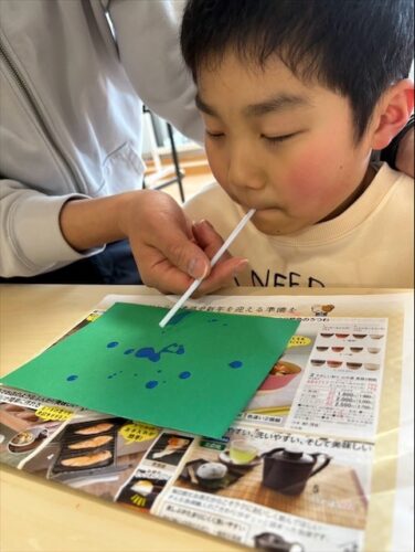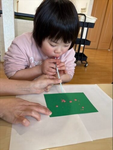 今日は絵の具とストローを使い子どもの吹く息で絵の具でデザインする吹き絵をしました!