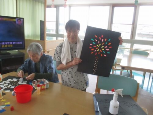 さわやか室蘭館 2F夏飾り制作中♪ 2024-07-14 2024-07-12 皆様こんにちは! 本日は2Fフロアの飾り制作の様子をご紹介します。 とても集中されています。 色の配置や彩りなどを、真剣に悩んでおりました。 打ち上げ花火素敵ですね~♡