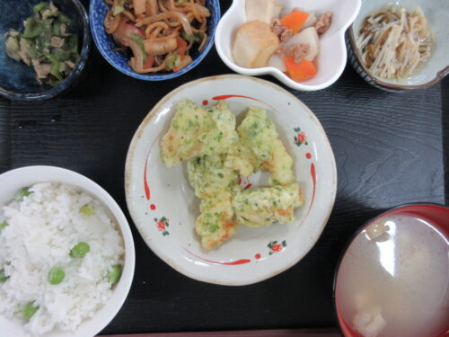 (土)グリンピースご飯・白身魚の磯部揚げ