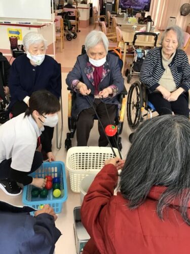 向かい合わせに座って頂き、細い棒をもちその上にボールをおいて