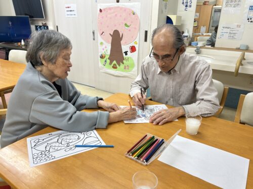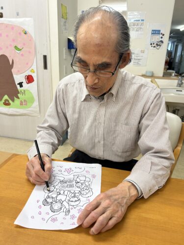 夕方は塗り絵の時間です!!今の時期の桜の絵やさくらもちの塗り絵を真剣に塗られています(*^-^*)