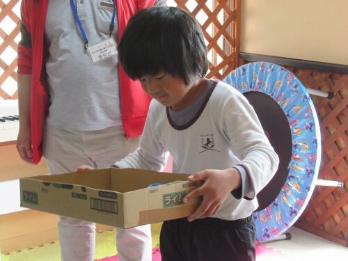 真ん中に穴の開いた箱のふたを持ち、