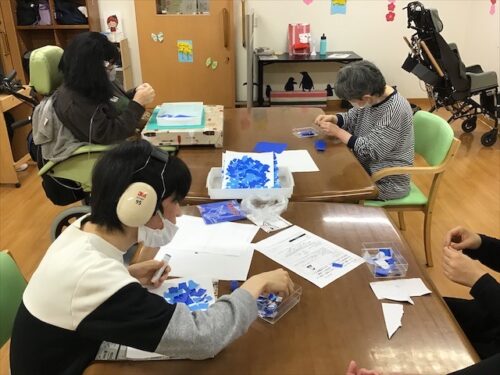 利用者様が、たくさん青色の折り紙をちぎってくださっています💙🩵