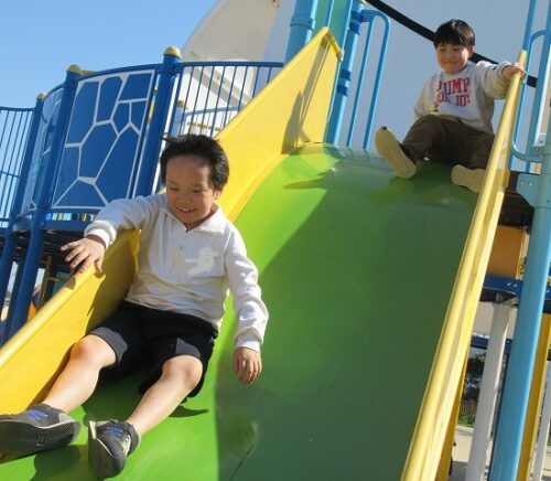 様々な滑り台を楽しむ子どもたち。