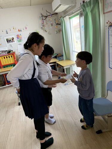 そして、一年生に「インタビュータイム」です。上級生にも、好きな給食のメニューなど、逆インタビューをしました。お祝いのメッセージカードは、5年生が代表して、渡してくれましたよ!