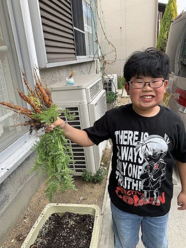プランターで育てたミニキャロットもベスト収穫シーズンです!一気に抜いてしまいました!!子ども達は喜んでお家に持って帰りましたよ^^葉っぱもふりかけにするとおいしいです!