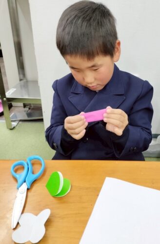 折り紙を折って切って四つ葉のクローバーと桜にします。