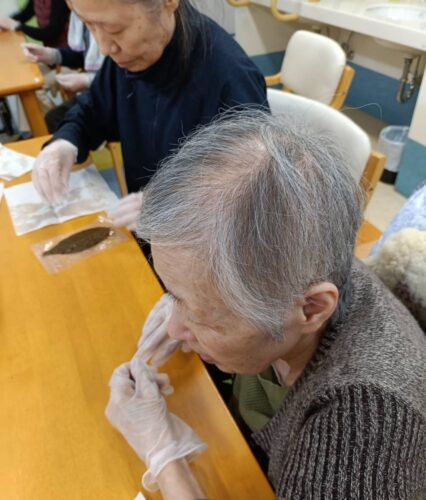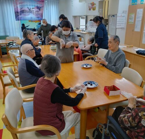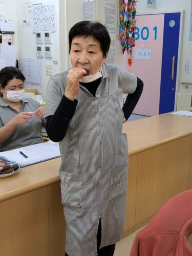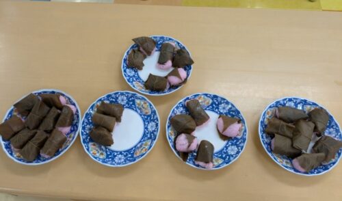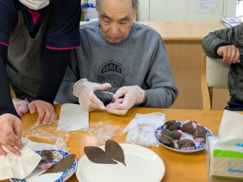 今回お昼のレクリエーションで桜餅をみんなで作りました。