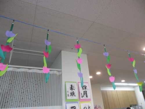 チューリップやたんぽぽ、色々な鯉のぼりと、デイサービス内には春満載です。