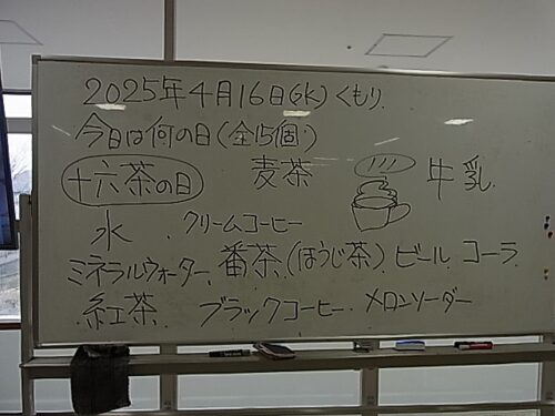 さわやか室蘭弐番館 2階 16日活力朝礼♪ 2025-04-17 2025-04-16 皆様こんにちは♪ 昨日の様子をお届けします 一日のスタートはラジオ体操です 続いて頭の体操 十六茶の日にちなみ 飲み物の種類お答え頂きました🍵 賑やかな一日になります様に☆