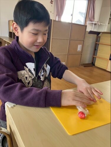「ぼく、ケーキいちご好き」「難しいなぁ」と自分の思いを伝えながらも笑顔で作る児童👨