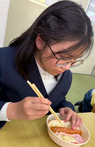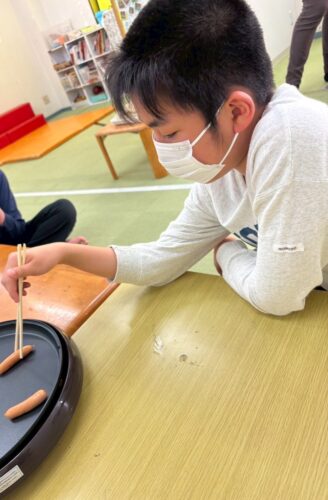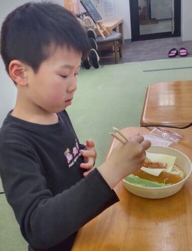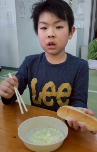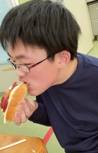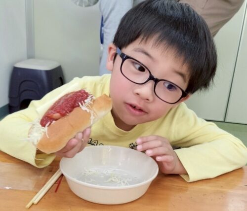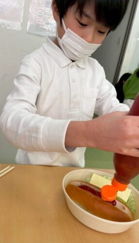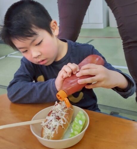 まずはウインナーを焼いて……。焦げないように、おいしそうな焼き加減にします。 キャベツをはさみます。慎重に、丁寧にしていました。 チーズとたっぷりケチャップ🧀🍅 手を合わせていただきます‼︎ 良い笑顔😆みんなおいしそうにもりもり食べました。