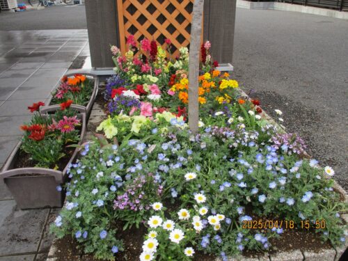 正面玄関前の花壇は彩とりどりのお花が咲いていて憩いの場所です