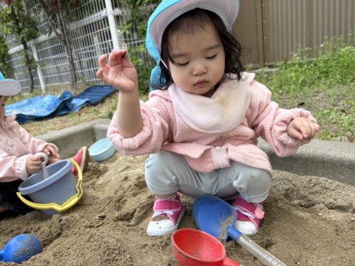 お砂場では、先生と一緒に、お山を作ったり