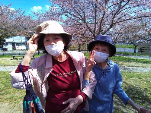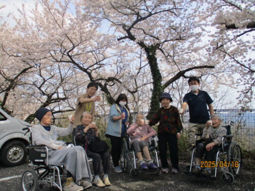 桜の下で、入所者様とお茶で乾杯!!♬いつもより美味しいですネ(^_-)-☆