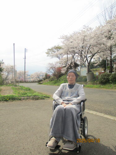 鳥居の傍にあるしだれ桜がとても風情があって、入所者様もずっと上を向いて風に揺られ、散る桜を眺めておられました。