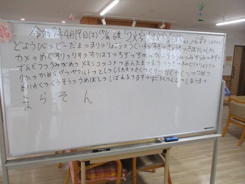 さわやか室蘭弐番館 3階 19日活力朝礼♪ 2025-04-20 2025-04-19 皆様こんにちは♪ 昨日の様子をお届けします 9時からラジオ体操です 続いて頭の体操 言葉つなぎです 文字数はあみだで決まりました 2文字・4文字・6文字です 素敵な一日になります様に☆