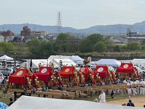 施設直ぐ近くの桂川の河原にお神輿が6基勢ぞろいします。\(@^0^@)/